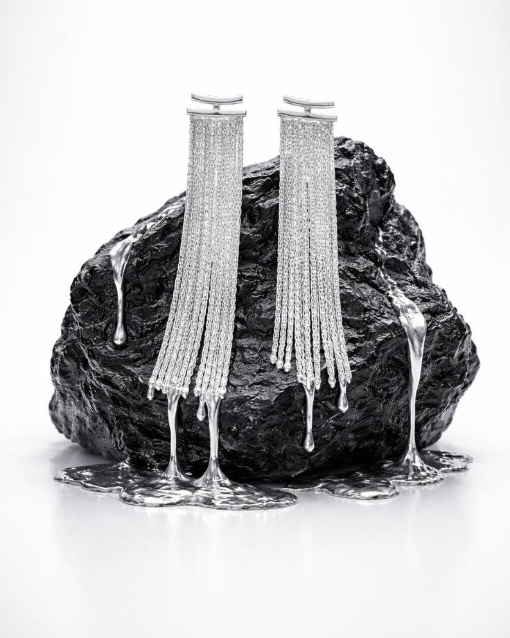 O design em fios prateados segue o contorno do gesto natural, movendo-se em harmonia com cada passo. Cada curva parece murmurar histórias invisíveis, transformando instantes simples em momentos de encantamento e serenidade, onde a delicadeza se manifesta sem esforço.