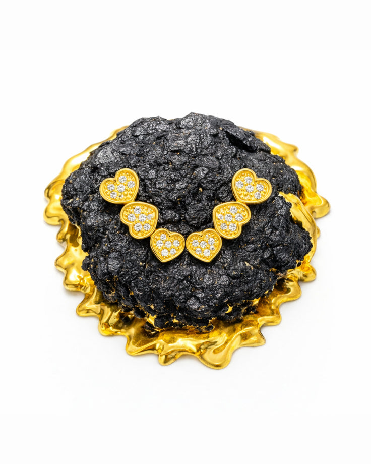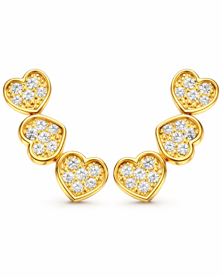 Produto classificado como semijoia. Brinco feminino modelo Ear Cuff Corações de Aurora, confeccionado em metal base com banho de ouro 24k aplicado como acabamento superficial. Adornado com zircônia sintética. Peça de uso ornamental, sem valor intrínseco de metal precioso. Não se trata de joia em ouro maciço.