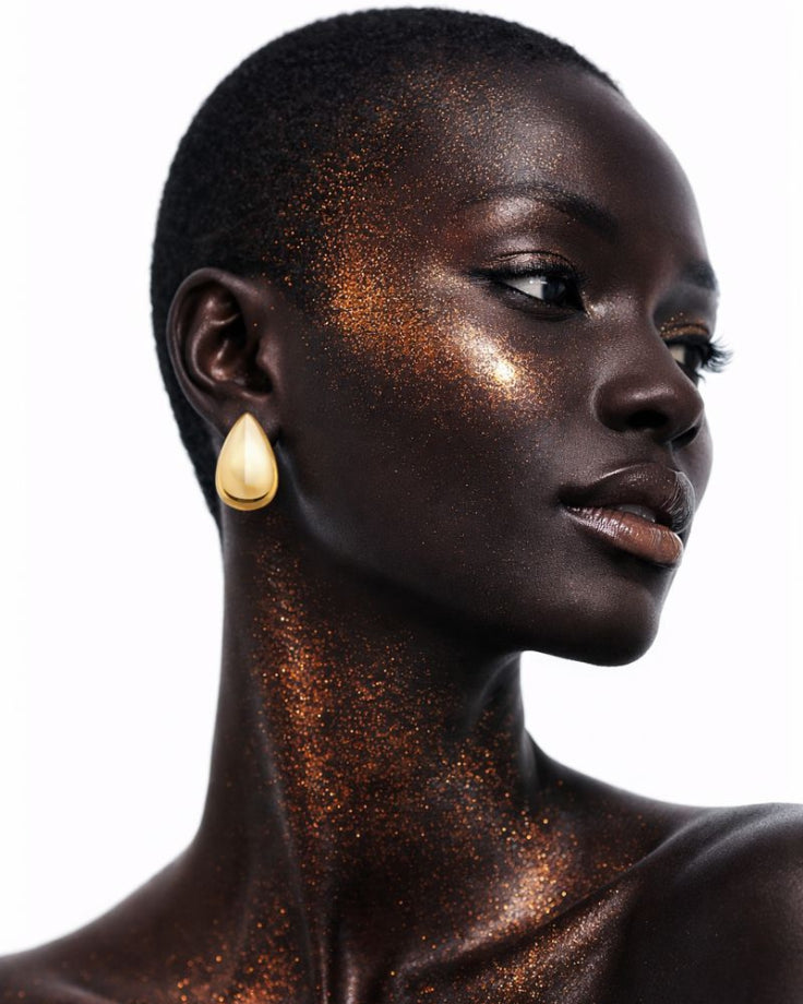 O dourado reflete a luz de forma discreta, criando brilhos suaves que surgem conforme o movimento do corpo.