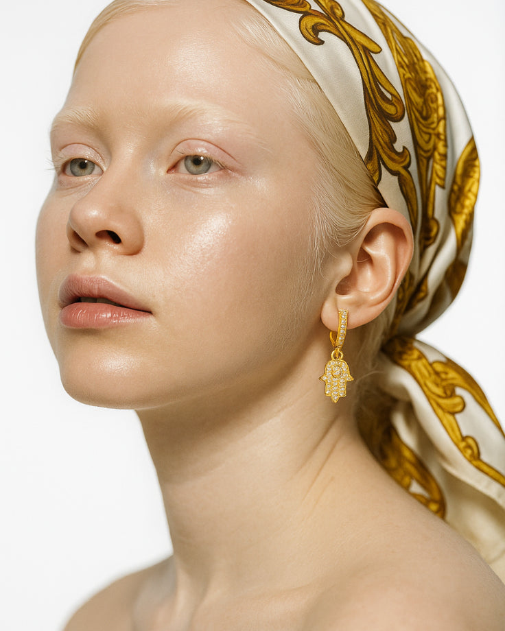O desenho de Hamsá abraça a orelha com especial atenção, como se cada curva fosse moldada pelo próprio significado do símbolo. O dourado reflete a luz discretamente, criando pequenos lampejos que se movem com naturalidade ao ritmo de quem os usa. Edom não é apenas lembrança, é eco da proteção que se mantém viva, guardando a harmonia silenciosa de séculos passados.