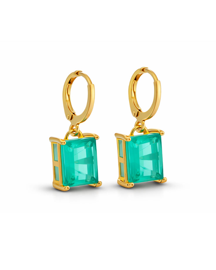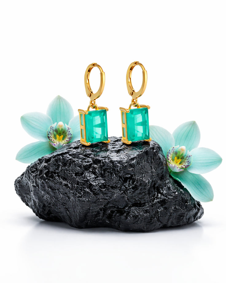 Produto classificado como semijoia. Brinco feminino modelo Pedras Verdes da Ilha de Thule, confeccionado em metal base com banho de ouro 24k aplicado como acabamento superficial. Adornado com zircônia sintética. Peça de uso ornamental, sem valor intrínseco de metal precioso. Não se trata de joia em ouro maciço.
