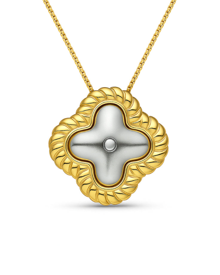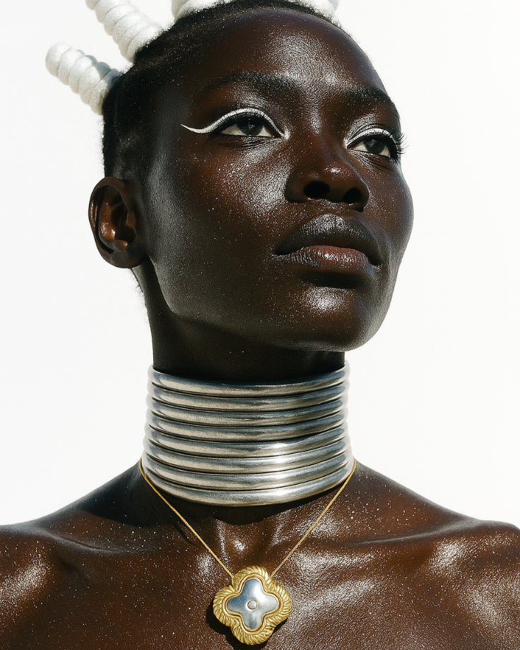 O contorno do colar desliza suavemente pelo pescoço, como se cada curva fosse moldada pelo crescimento da flor e pelo movimento silencioso da luz que a banha.