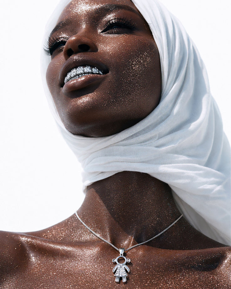 O pingente desliza suavemente pelo pescoço, como se cada curva fosse moldada pelos raios prateados que Stella deixava ao passar.