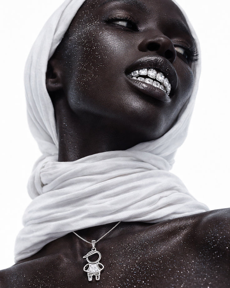 O pingente exclusivo suave sobre o peito, como se cada detalhe fosse moldado pela própria luz lunar.