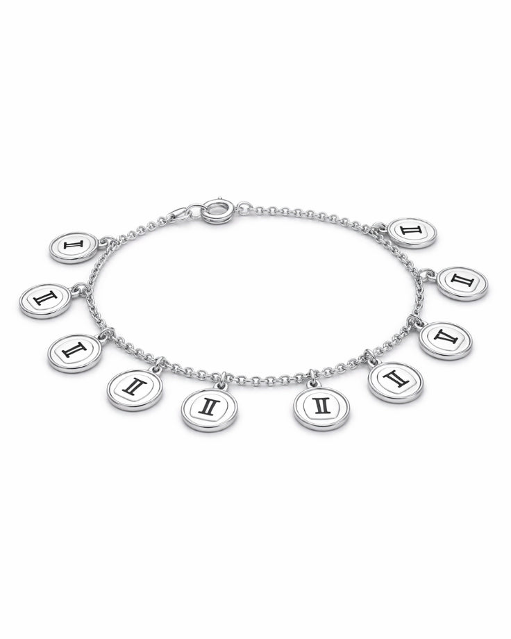 Produto classificado como semijoia. Pulseira feminina modelo Os 10 Mandamentos – Leges Dei, Aeternae, confeccionada em metal base com banho de ouro branco 24k aplicado como acabamento superficial. Adornada com zircônia sintética. Peça de uso ornamental, sem valor intrínseco de metal precioso. Não se trata de joia em ouro maciço.