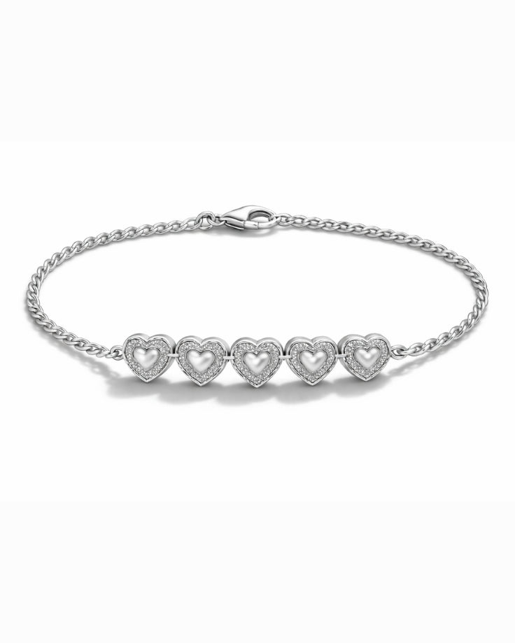 Produto classificado como semijoia. Tornozeleira feminina modelo Corações d'Prata, confeccionada em metal base com banho de ouro branco 24k aplicado como acabamento superficial. Adornada com zircônia sintética. Peça de uso ornamental, sem valor intrínseco de metal precioso. Não se trata de joia em ouro maciço.