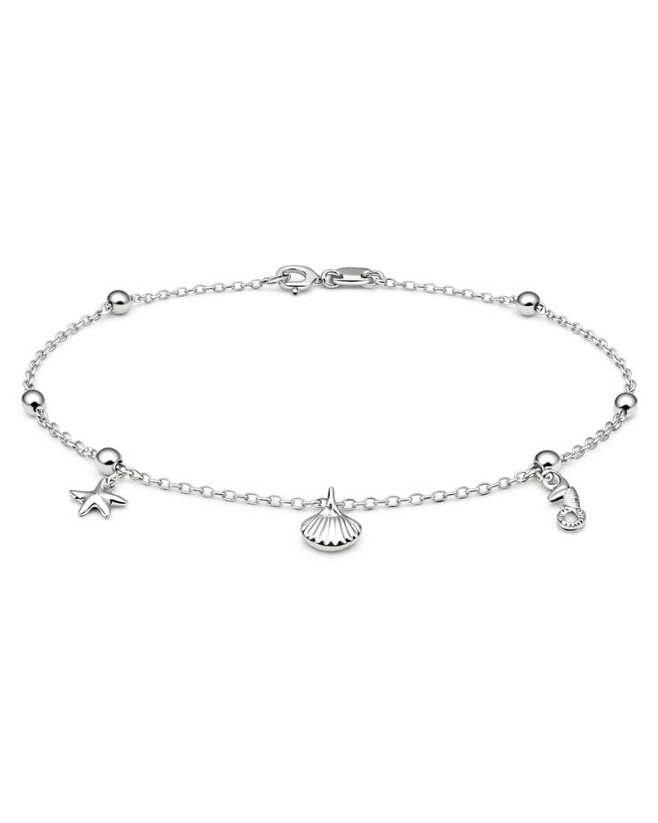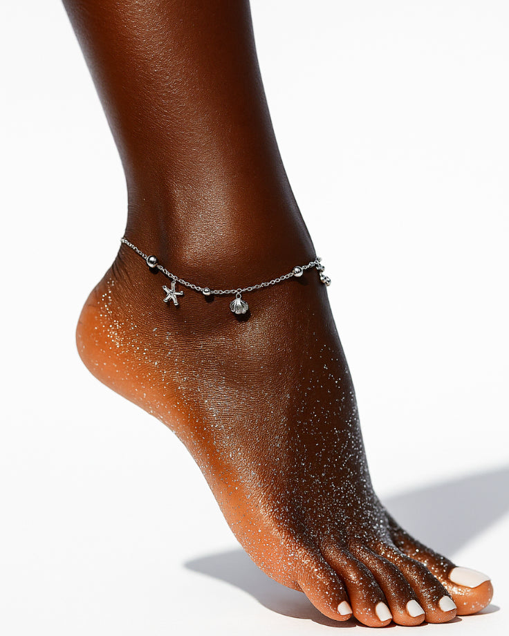 Em prata delicada, os pingentes repousam suavemente sobre o tornozelo, refletindo a luz como o sol sobre a superfície do mar.